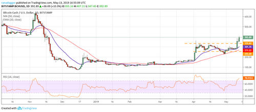 Bitcoin Cash (BCH) soared above the range on May 11, which is a positive sign. We like the way the bulls held the price above the previous resistance-turned-support of $335.62. The 20-day EMA has turned up and the RSI has reached the overbought zone. This shows that the bulls are in command.