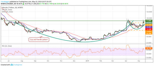 A breakout and close will complete the bullish cup and handle pattern. This has a target objective of $158.91. Traders can buy the LTC/USD pair on a breakout and close (UTC time frame) above $91. The stop loss can be kept at $70, which can be raised later. Please keep the position size about 50% of usual as the risk of a pullback is high.