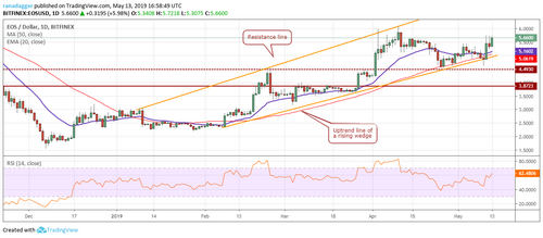 On the contrary, if the EOS/USD pair fails to sustain above the overhead resistance at $5.50, it can remain range bound between $4.4930 and $5.50 for a few days. It will turn negative on a breakdown and close below $4.4930. We do not find a buy setup that gives us a good risk to reward ratio at current levels, hence, we do not recommend a trade in it.
