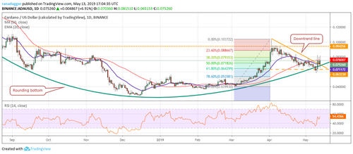 Cardano (ADA) reversed direction from $0.057898 on May 10 and broke out of the downtrend line on May 11. It has been facing resistance at $0.080 for the past two days. Both the moving averages are flat and the RSI is just above the midpoint. This suggests a range formation in the short term.