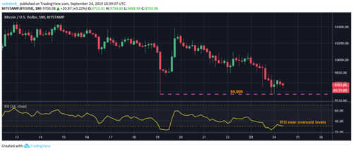 If the support level continues to hold ground in the U.S. trading hours, the cryptocurrency may rise back toward $9,900, as the RSI is hovering very close to the oversold territory (below 30).