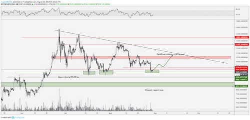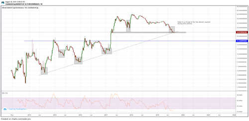Notably, a potential support level and a trendline are coming into play. Comparable to the beginning of 2016, in which the dominance of altcoins fell from 16% to 8% — this occurred prior to big upwards movements. For example, Ether (ETH) went up by 1700% in the months after, Vertcoin went up by 800%, etc.