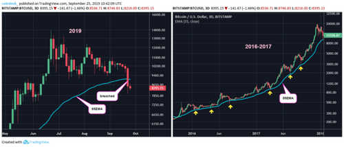 BTC has found acceptance below the 55-candle exponential moving average, which served as a strong base during the 2016-2017 bull market.
