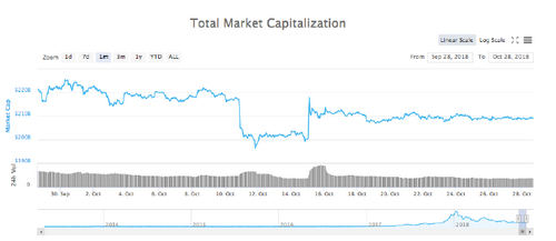 Ethereum (ETH), the second cryptocurrency by marSunday, Oct. 28: crypto markets have seen some minor fluctuations, with most of the top 20 coins by market cap seeing price changes within 1 percent over the past 24 hours, according to CoinMarketCap.ket cap, is up around 0.2 percent over the day and trading at around $204 as of press time. According to CoinMarketCap, the leading altcoin is down around 0.7 percent over the week.