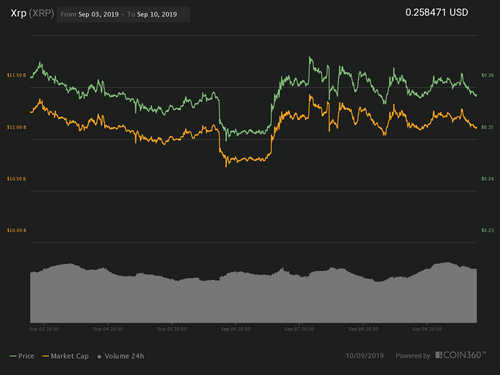 Ripple’s XRP token continues to trade completely flatly, showing a loss of a negligible 0.05% on the day. At press time, the world’s third-most popular coin is trading at $0.259 — the same price as 24 hours ago.