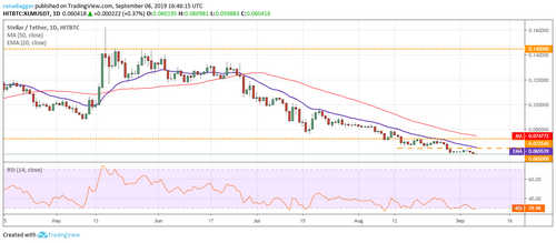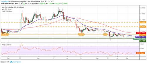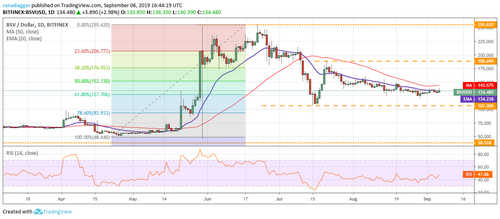 Bitcoin SV (BSV) has been trading in a tight range for the past few days. Both moving averages are flat and the RSI is just below the midpoint. This suggests a balance between buyers and sellers. The balance will tilt in favor of bears if the price dips below the immediate support of $120. The next critical support to watch on the downside is $107. A breakdown of this level will be a huge negative.