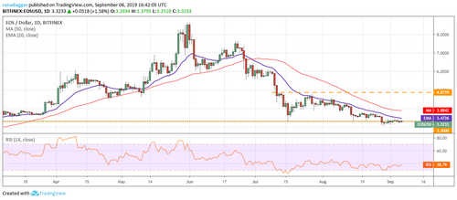 EOS has been trading close to $3.30 for the past few days. This shows that both bulls and bears are undecided about the next direction. This state of indecision is unlikely to continue for long. We should soon see a pickup in volatility.
