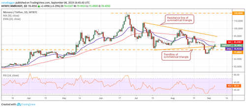 Monero (XMR) has re-entered the symmetrical triangle, which is a positive sign because it shows that markets have rejected the breakdown from the triangle. It is now likely to move up to the resistance line of the symmetrical triangle.
