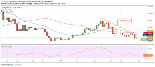 The EOS/USD pair is currently in a downtrend. The bears broke below the critical support of $3.1534 the week before, which shows continued selling pressure. However, the bulls are currently attempting to push the price back above $3.1534. If successful, a move to the downtrend line is possible.