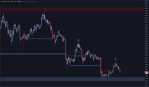 The 4-hour chart tells a compelling picture, where two resistance levels were broken recently (labeled A and B) and ETH/USD started to show a bit of strength. However, during both times, ETH price was pushed back down for more doom and gloom.
