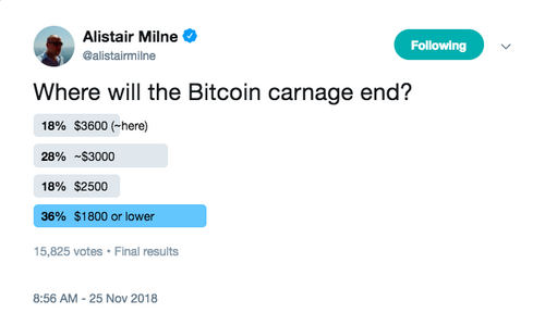 Recently, crypto investor and Bitcoin evangelist Alistair Milne tweeted a poll asking the crypto community to share their opinion about what Bitcoin’s bottom would be. 36 percent of respondents suggested that Bitcoin could drop to lower than the $1,800 threshold soon, while 26 percent predicted $3,000.