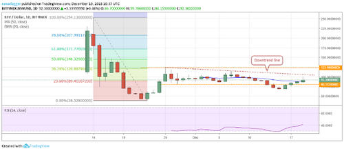 Bitcoin SV is back in the range $80.352–$123.98. Currently, the price is facing resistance at the downtrend line.