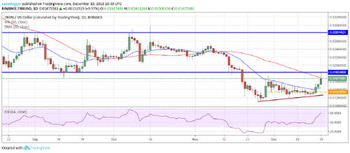 TRON has proven its status as an outperformer among the top cryptocurrencies. Its pullback has breached the 50-day SMA and is retesting a major support at $0.0183.