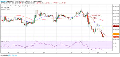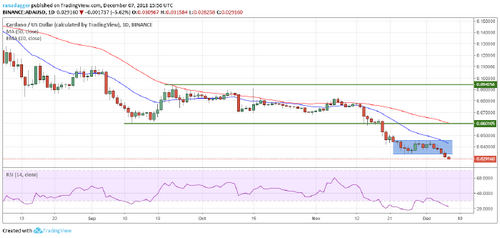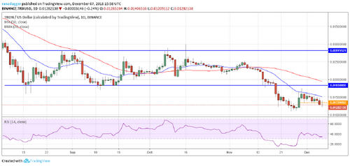 TRON has broken down of the immediate support of $0.01339050. Its next support is at the Nov. 25 low of $0.01089965. The moving averages are trending down, and the RSI is in the negative zone, which shows that the sellers have an upper hand.