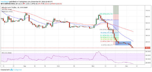 Bitcoin Cash continues its journey southwards. Within three days, the price slumped from an intraday high of $157.58 on Dec. 4 to an intraday low of $104.99 on Dec. 7. Currently, the bears are trying to sustain below the psychological support of $100, while the bulls want to maintain the price in triple digits.