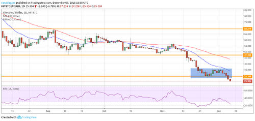 The bears have broken down of another critical support at $28. Litecoin can now slide to $20, where we expect buying to emerge.