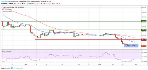 The rebound in Ethereum fizzled out at $127.87. It continues to be in a downtrend but for the past seven days it has been trading inside the range $130.5-$102.2.