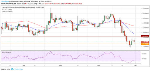The bears will try to breakdown the recent lows of $0.13427050 and plunge the XLM/USD pair to $0.08 levels. On the contrary, the bulls will try to defend the zone between $0.13427050 and $0.1547188. We shall turn positive on the virtual currency if the price sustains above $0.184.