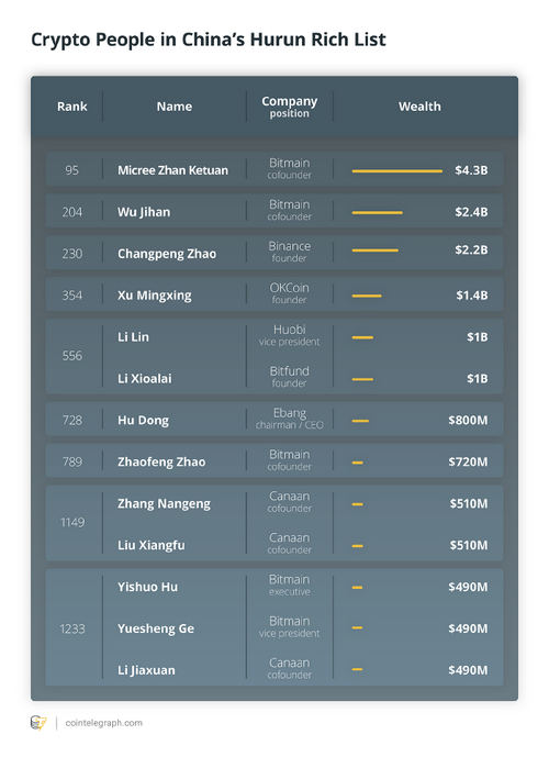 OkCoin’s Star Xu, Binance’s CZ, Huobi founder Li Lin and Bitcoin whale Li Xiaolai all made an appearance on the rich list.