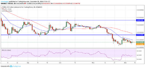 For the past few days, the bulls are facing a stiff resistance at the 20-day EMA, which is sloping down. The price has gradually drifted close to the Nov. 25 low of $0.01089965. A break of the low will resume the downtrend that can stretch to $0.00844479.