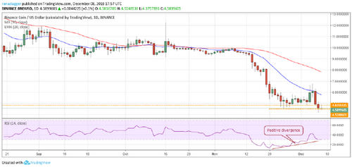 The digital currency turned around and slumped sharply on Dec. 6 and 7, resulting in a new low. The bears are attempting to resume the downtrend, while the bulls are trying to pull back from the current levels. The RSI is showing a positive divergence, which is a bullish sign. We anticipate a trend change if the price breaks out of $7 levels. Traders should wait for a new buy setup to form before investing.