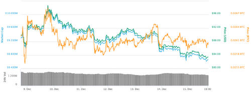 On the weekly chart, the current ETH prices today are the lowest. Seven days ago Ethereum was trading at $87, but then shortly peaked at $98.90 last Sunday, Dec. 9, before starting a decline towards the current price.