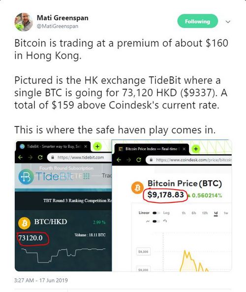 First spotted by Mati Greenspan of eToro, Bitcoin has begun to trade at a small but noticeable premium on Hong Kong-based exchanges, like one named “TideBit”. Greenspan notes that on the exchange, BTC is trading for a number of Hong Kong Dollars worth around $9,340, while the asset traded for $9,180 on platforms like Coinbase. This represents a 2% premium.