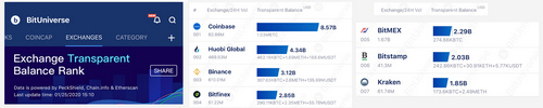 Exchange reserves according to Bituniverse (left) and Chain.info (right) on April 12, 2020. Chain.info stats are slightly different than Bituniverse’s stats.
