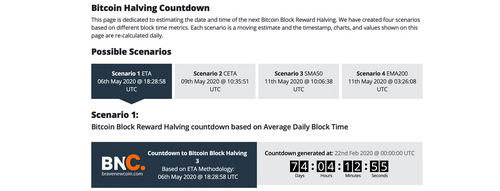 The statistics on Brave New Coin’s halving page show a few different countdowns. There are actually four scenarios and countdowns for May 6, 9, and two different May 11 forecasts. “This page is dedicated to estimating the date and time of the next Bitcoin Block Reward Halving”, explains Brave New Coin’s stats page. “We have created four scenarios based on different block time metrics. Each scenario is a moving estimate and the timestamp, charts, and values shown on this page are re-calculated daily.” Users interested in monitoring the page get a different perspective than a simple countdown clock.