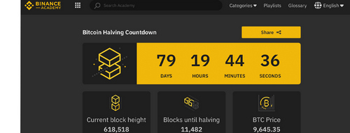 Binance also has a statistical page dedicated to the BTC halving and the countdown from Binance Academy says 79 days until the halving. The stats page also shows the current block height, how many blocks are left until the halving, and the current BTC price. The site also gives people educational information on the halving by answering frequently asked questions like “What is a block halving?”, “Why are halvings significant?”, and “How many Bitcoin halvings have there been previously?”
