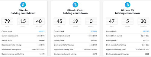 Bitcoin enthusiasts who want to see all the countdown clocks on one single page can reference the Blockchair website for stats on all three networks. Blockchair’s tools page on the 2020 halvings shows BTC (79 days), BCH (45 days), and BSV (47 days). The stats page also shows the current block and blocks remaining until the halving on each network. From each countdown window, users can toggle directly to each network’s block explorer for more data on these three networks.
