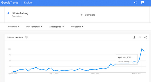 At the time of publication, there is 18,337,650 BTC in circulation and there will only be 21 million BTC issued. With the halving approaching with a quickness, searches about the subject have skyrocketed during the last three weeks. This week (April 19-25), the query for the phrase “bitcoin halving” is hovering around a 90 out of 100.