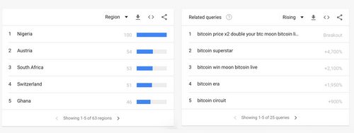A common theme used by scammers is artificially pumping the “related queries” which are related to scams like “bitcoin superstar”, “bitcoin era”, and “bitcoin moon.” These related queries are the top “breakout” keywords on a daily basis and they are likely invoked by those looking to capitalize on people’s browser searches.