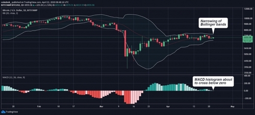 The daily chart’s MACD histogram, an indicator used to identify trend strength and trend changes, is about to cross below zero for the first since March 20. The impending bearish crossover on the MACD suggests the price squeeze could end with a sell-off. The immediate support of the lower Bollinger band is located at $6,571.