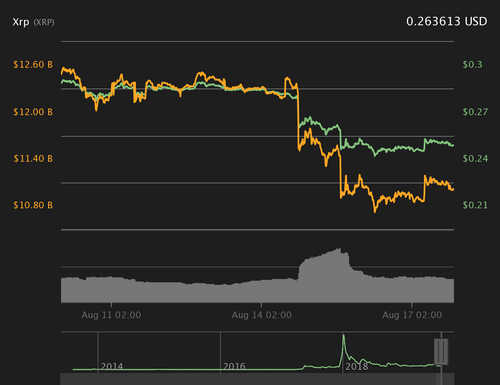 XRP is currently trading in the green at around $0.263, leaving it up 0.46% over the past day. Earlier today, the altcoin saw an upswing to $0.267. On its weekly and monthly charts, XRP is down by 11.43% and 14.24% respectively.