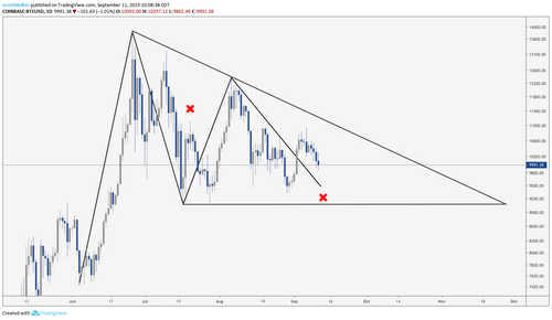 Twitter is bearish, abuzz with chatter of a descending triangle that is forming on the Bitcoin (BTC) chart and with comparisons to the descending triangle that broke down in 2018 at $6,000.