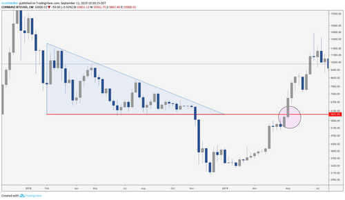 Further, traders would expect the bottom line of the triangle to behave as significant resistance on the first retest. This was the reason that crypto Twitter insisted that Bitcoin would be strongly rejected at a retest of $6,000 from the bottom. We were screaming the opposite and publicly opening additional long positions.
