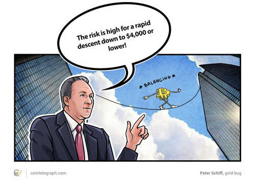 A cheery prediction of six-figure BTC prices somehow doesn’t seem appropriate this week. Gold bug Peter Schiff, who has never knowingly passed up an opportunity to bash Bitcoin, has a rather gloomy forecast for the world’s dominant cryptocurrency. After BTC shed $1,800 in a matter of hours, he warned: “The risk is high for a rapid descent to $4,000 or lower!”