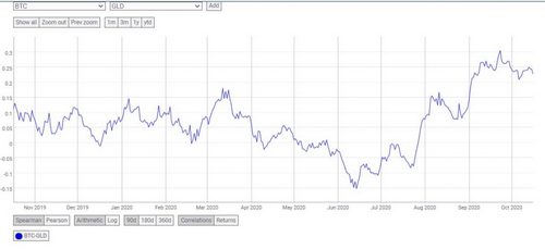 Additionally, the correlation between Bitcoin and Gold has continued to increase since mid-June as can be seen in the following chart courtesy of CoinMetrics.io.