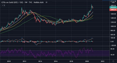 Furthermore, the current state of Gold in the markets is one of short-term bearishness with the price of Gold currently trading at $1,898 and below the 50-day moving average. From the weekly chart, the value of Gold is very overextended after its recent peak at around $2,077 as seen in the weekly chart below. Also from the weekly Gold chart, it can be observed that the MACD is showing signs of weakness as well as the weekly RSI.