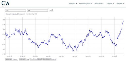 Checking the correlation chart on Coinmetrics reveals that Bitcoin’s 360-day correlation to the SP 500 is at record high levels as seen in the chart below.