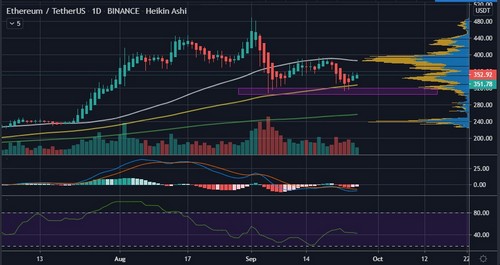 Furthermore, and using the daily ETH/USDT chart, it can be observed that Ethereum has printed what looks like a double-bottom pattern at the low $300 price area.
