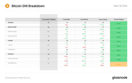 Network Health improved through solid gains in both Network Growth and Network Activity, the former reaching the highest possible value for the first time since 2017. Liquidity has seen marginal improvement over the last few weeks after registering increases in Transaction Liquidity and slight decreases in Trading Liquidity. After staying close to the 50 point mark for 5 weeks, it has now worked its way up by 9 points. In the lead up to Bitcoin’s third halving, Sentiment, on the other hand, has begun to drop sharply. Despite this, however, overall network health remains strong.