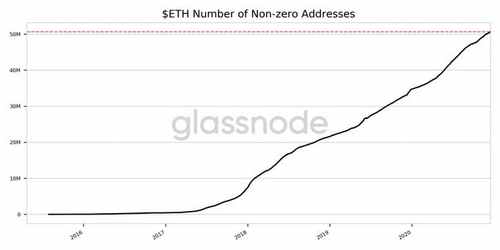 In the case of Ethereum, the number of non-zero addresses has reached an all-time high of 50.656,493. Below is a chart also from Glassnode, demonstrating the growth in the number of non-zero addresses on the Etheruem network.
