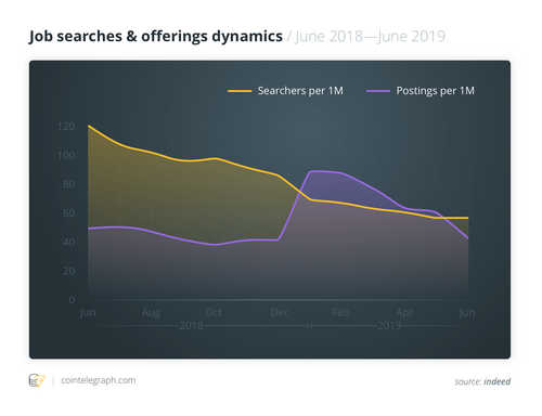 People began to search for blockchain jobs twice less. This trend was identified by Indeed analysts, who shared the comparative statistics with Cointelegraph. According to it, the share of the blockchain- and cryptocurrency-related job searches has declined by 52% over the last year (June 2018-June 2019).