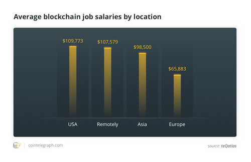 Researchers at TeqAtlas analyzed open vacancies for blockchain-related jobs for the current year. As it turned out, the highest salaries are still paid in the U.S. ($109,773 on average), a little less is received by specialists in Asia ($98,500), while the average salary of a European employee ($57,500) is 30% lower than that of an American. At the same time, job seekers from other countries may get a higher-paying job by applying for a remote vacancy.