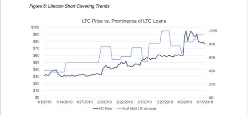 As for litecoin shorting: in mid-March, clients borrowed a lot as the price was around $60, “another level speculators believed to be a top. But that belief was not correct and yet again, the shorts covered before the price rallied swiftly to $90. Like clockwork, they re-engaged after the price established itself in the $80-90 range”, the report says.
