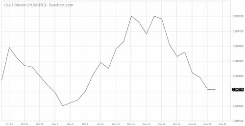 Lisk’s value relative to bitcoin has declined sharply in recent weeks as the original blockchain currency surged past $11,000 for the first time. LSK/BTC peaked at 0.001202 on Nov. 15 before hitting those levels again a few days later. Prices have since plunged to 0.000710 for a decline of more than 40%.
