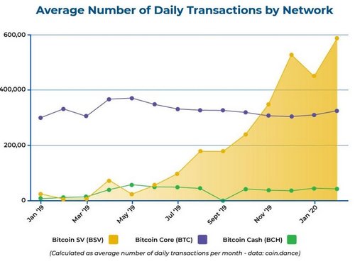 The report cites data showing transactions grew to almost 600,000 a day by February, which was considerably higher than BTC. Critics however have argued much of the transaction volume on BSV is ‘busy work’ from apps writing weather or crypto price data to the blockchain.