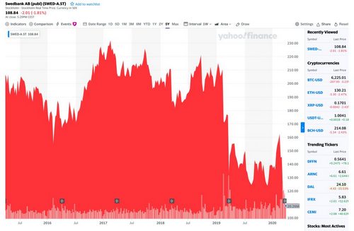 Swedbank’s stock price on a 5-year view, with a sharp drop clearly visible after last year’s money-laundering revelations, failing to recover.